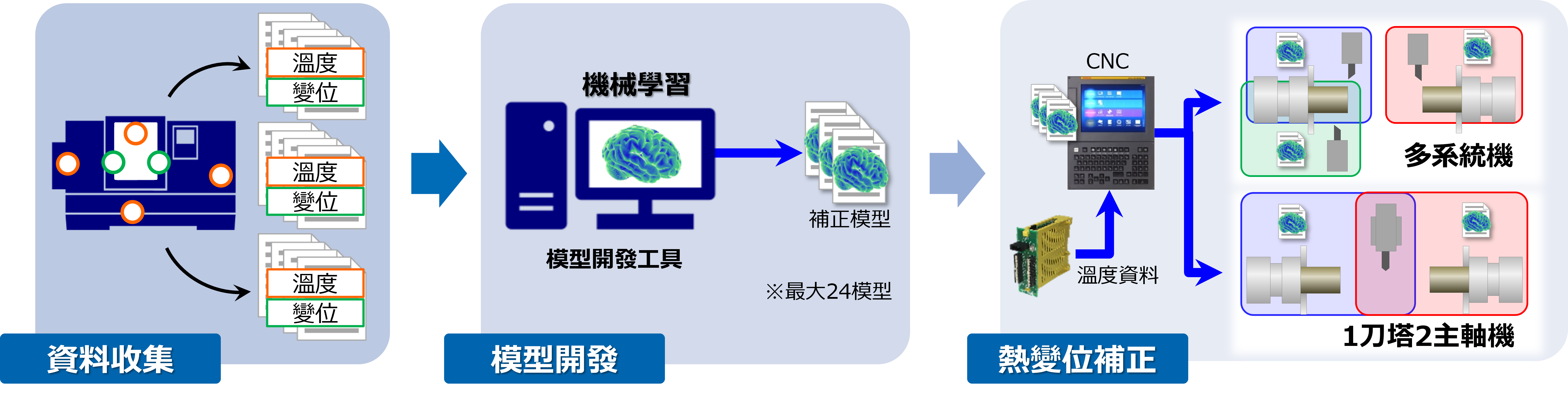 透過機械學習生成熱變位模型,根據模型和溫度對熱變位進行預測和補正