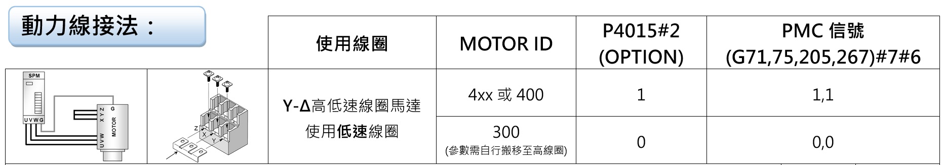 請先確認該顆馬達的線圈(捲)形式為Y-Δ還是Y-Y,根據不同的線圈有不同的接線方式,在參數上請使用PLC訊號切換即可