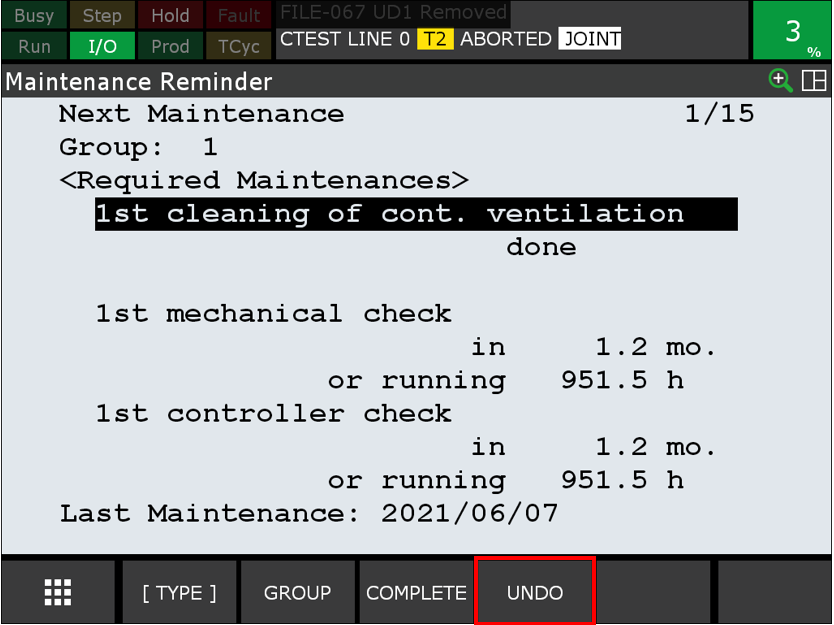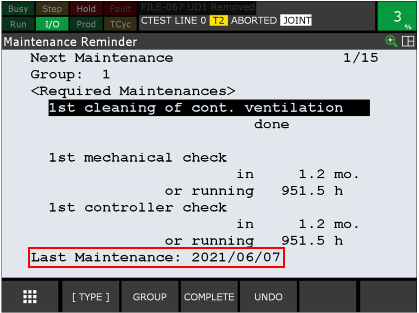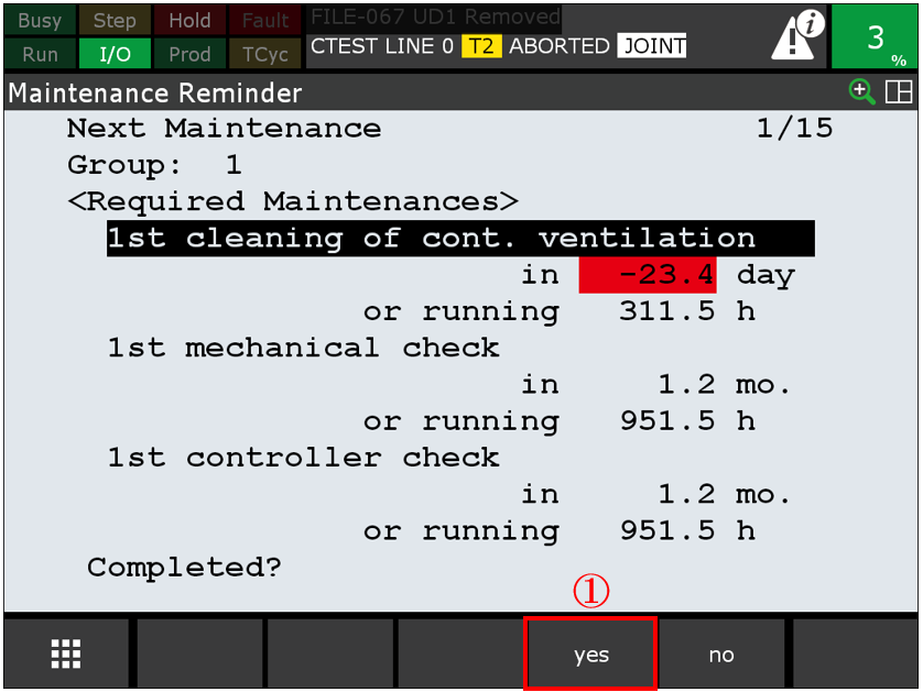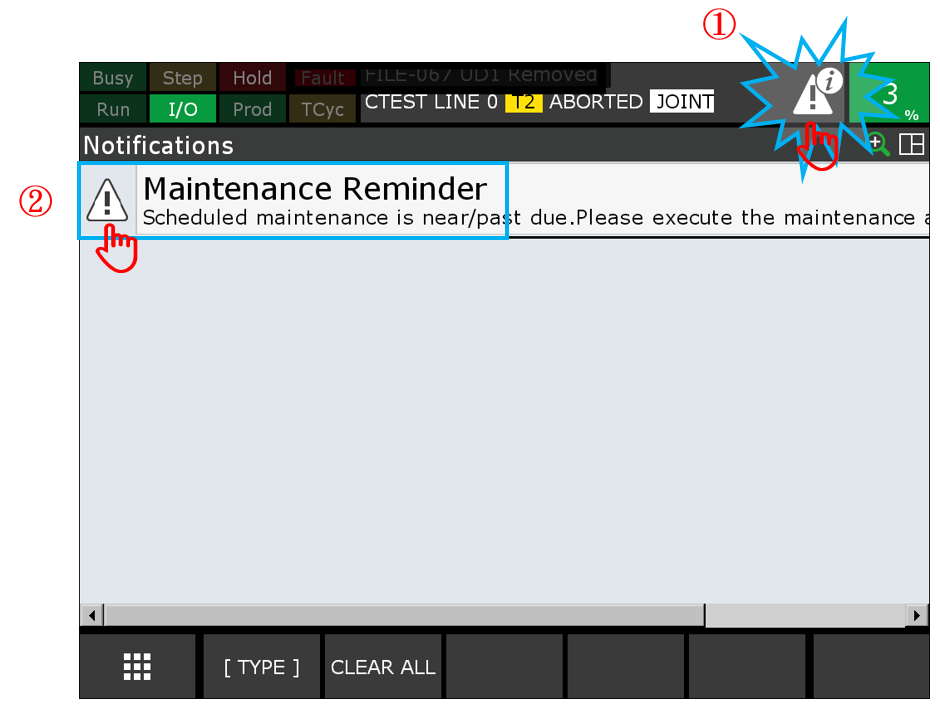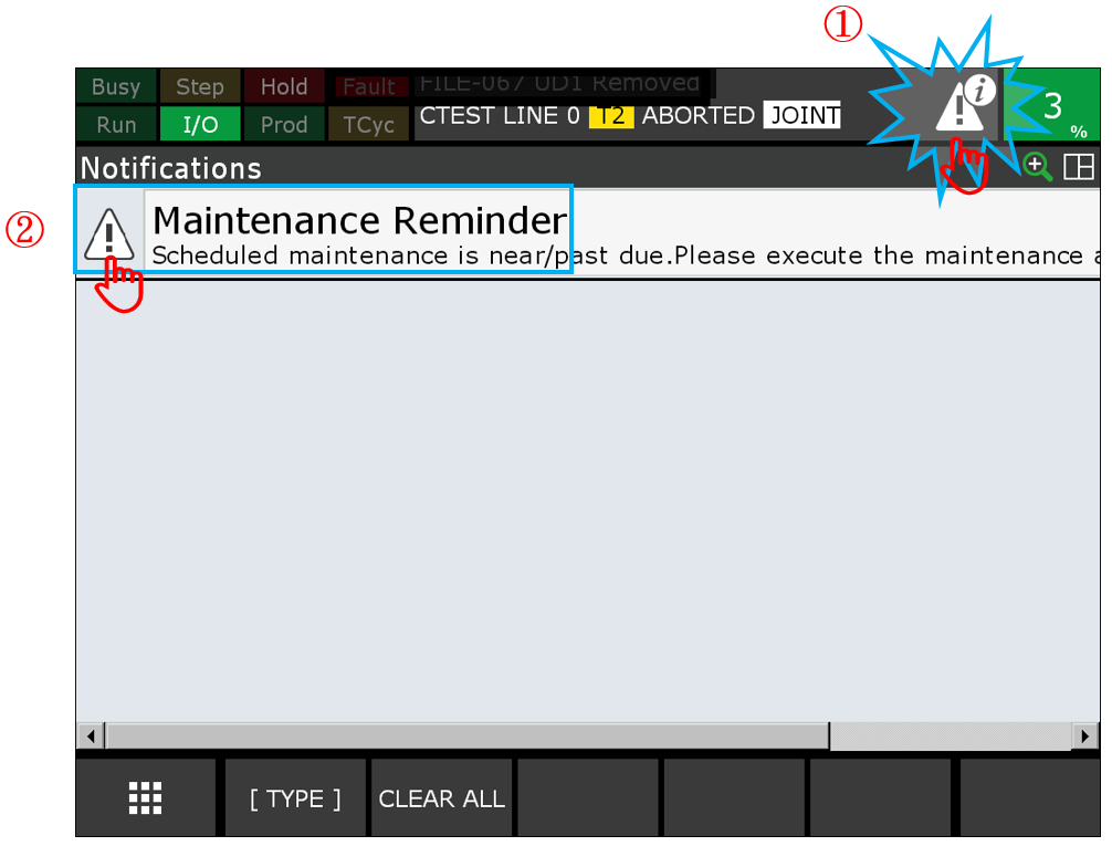 若不是, 於iPendant 上, 按壓 [MENU] 鍵 -> 0. NEXT -> 4.STATUS ->選擇 Reminder